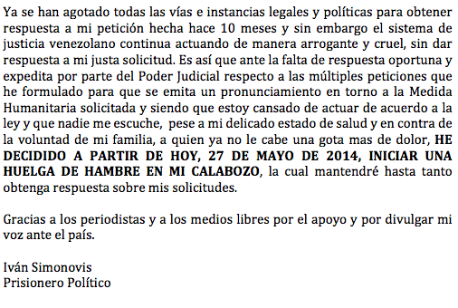 El abogado destacó que la salud de Simonovis, de 53 años de edad, puede agravarse con la huelga de hambre, puesto que aunque llegó a la cárcel hace 9 años siendo un hombre sano, ahora padece 19 enfermedades, entre ellas diabetes y problemas renales.
